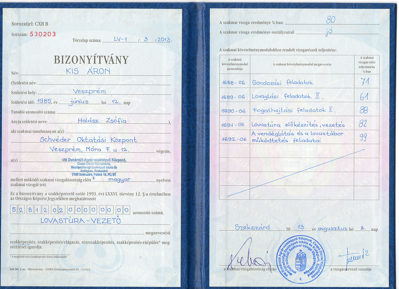 Trail rides will be conducted with the highest level of professionalism and service. We attach the license of Kis Áron, our horse-riding guide expert.